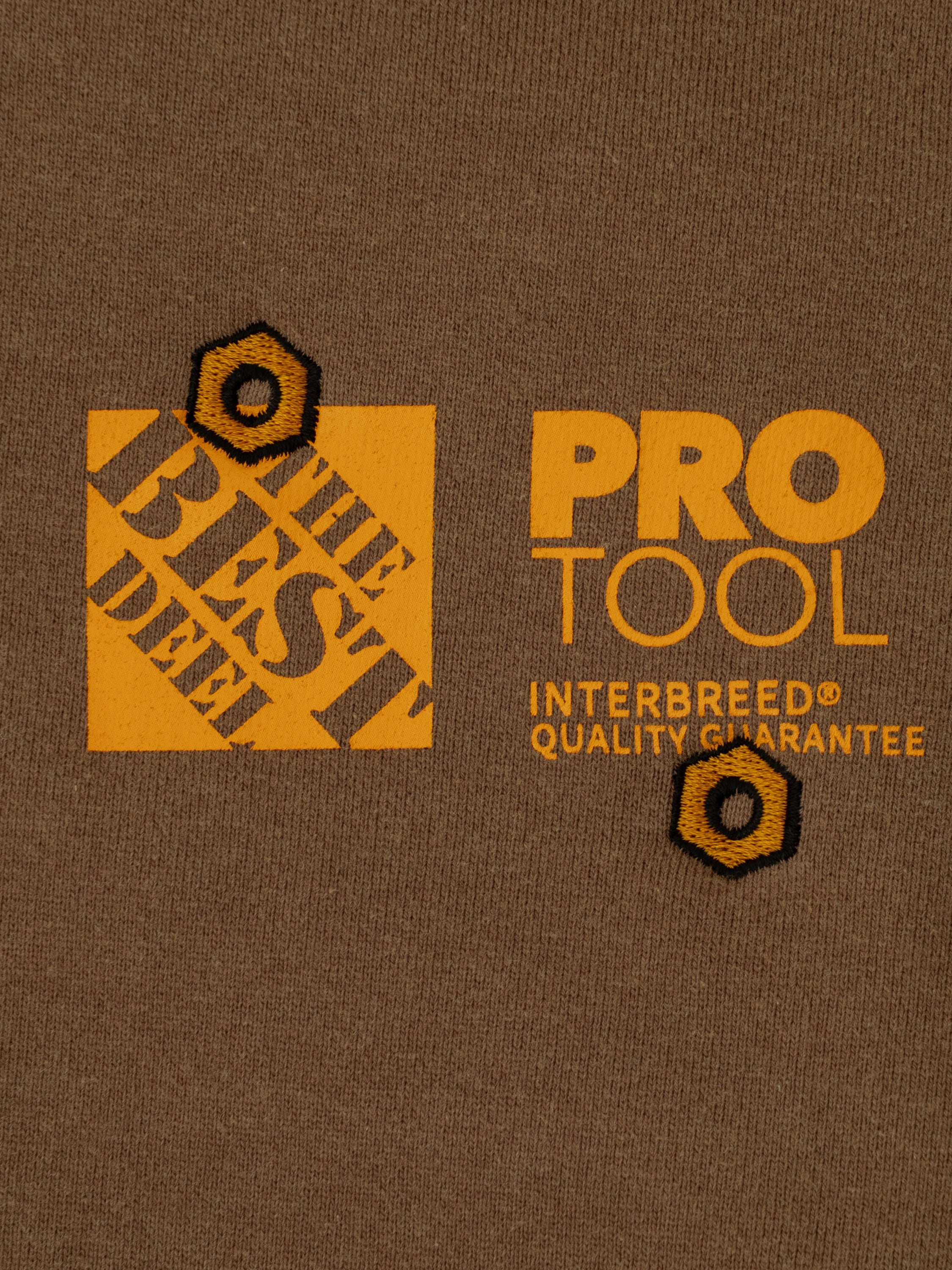 ホームセンターのユニフォームがコンセプトのデザインで、身頃には”Work”をテーマにサンプリングしたロゴをシルクプリントを配置し、左胸プリント上にはナットの刺繍を重ねています。